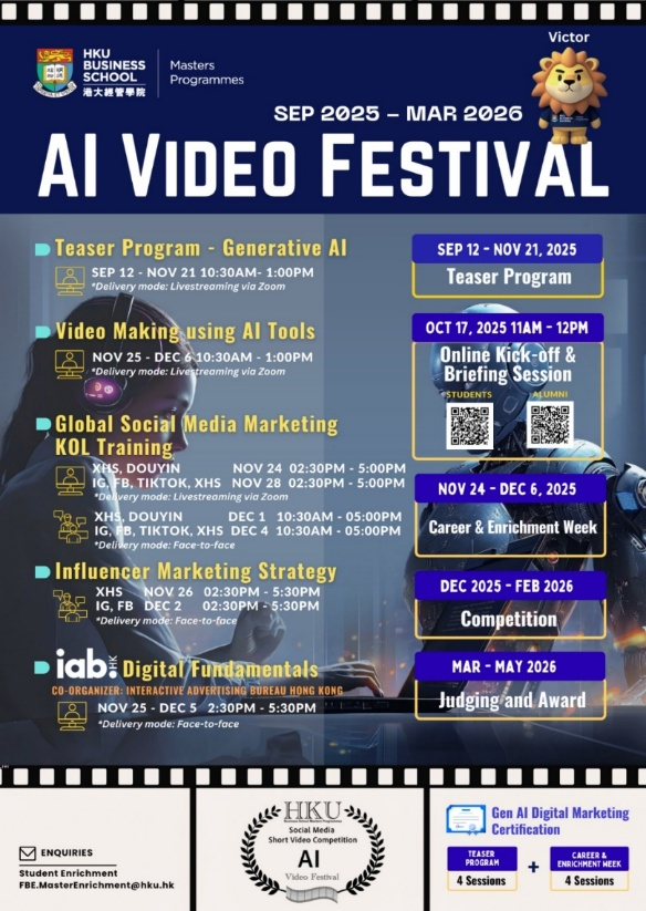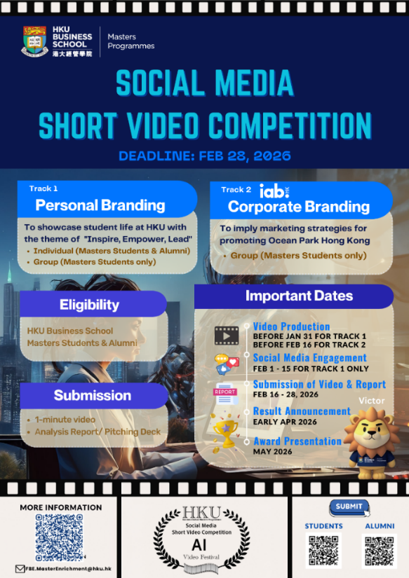 With a series of workshops and the Social Media Short Video Competition, the festival offers a fantastic opportunity to explore the intersection of AI and video making, showcase your marketing strategies and connect with fellow students and alumni. Let’s inspire, empower, and lead together in this creative journey!