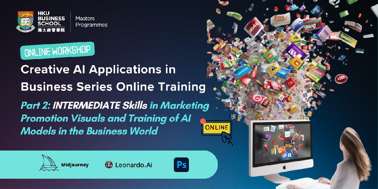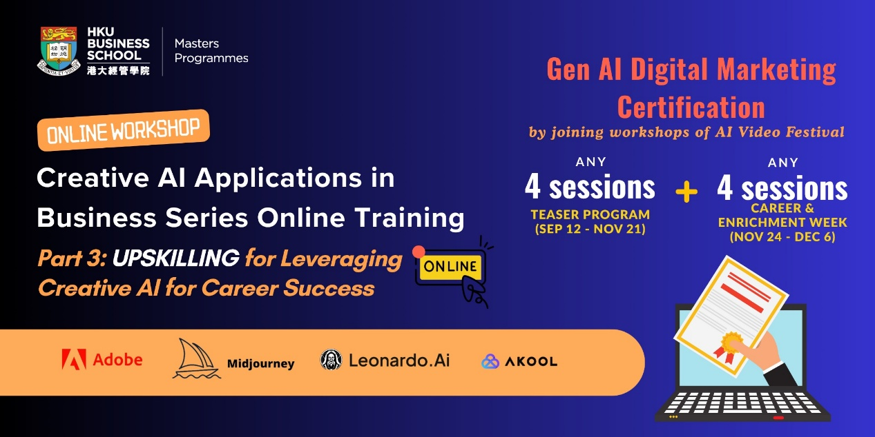 The "Creative AI Applications in Business Series Online Training," offered by the HKU Business School for its students and alumni, serves as the Teaser Program of the AI Video Festival. It is designed to provide a structured learning path. The curriculum is clearly divided into three phases: Level 1 Basic Knowledge Training, Level 2 Intermediate Skills, and Level 3 Advanced Upskilling. Through this immersive experience, participants will progress from foundational knowledge to mastering skills in utilizing tools like Midjourney, Leonardo AI, and Adobe to create compelling visuals, and ultimately develop advanced, execution-ready abilities. The program emphasizes practical application, guiding participants to transform raw AI outputs into professional-grade assets and build strong portfolios, enabling them to stand out in the evolving digital workplace.